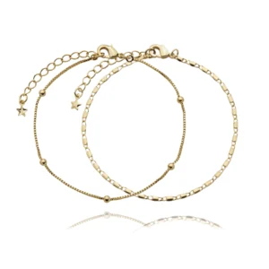 Pulseirismo: Monte um mix de pulseiras e braceletes delicados. Você pode misturar banhos, como dourado e prata, para um visual mais interessante.